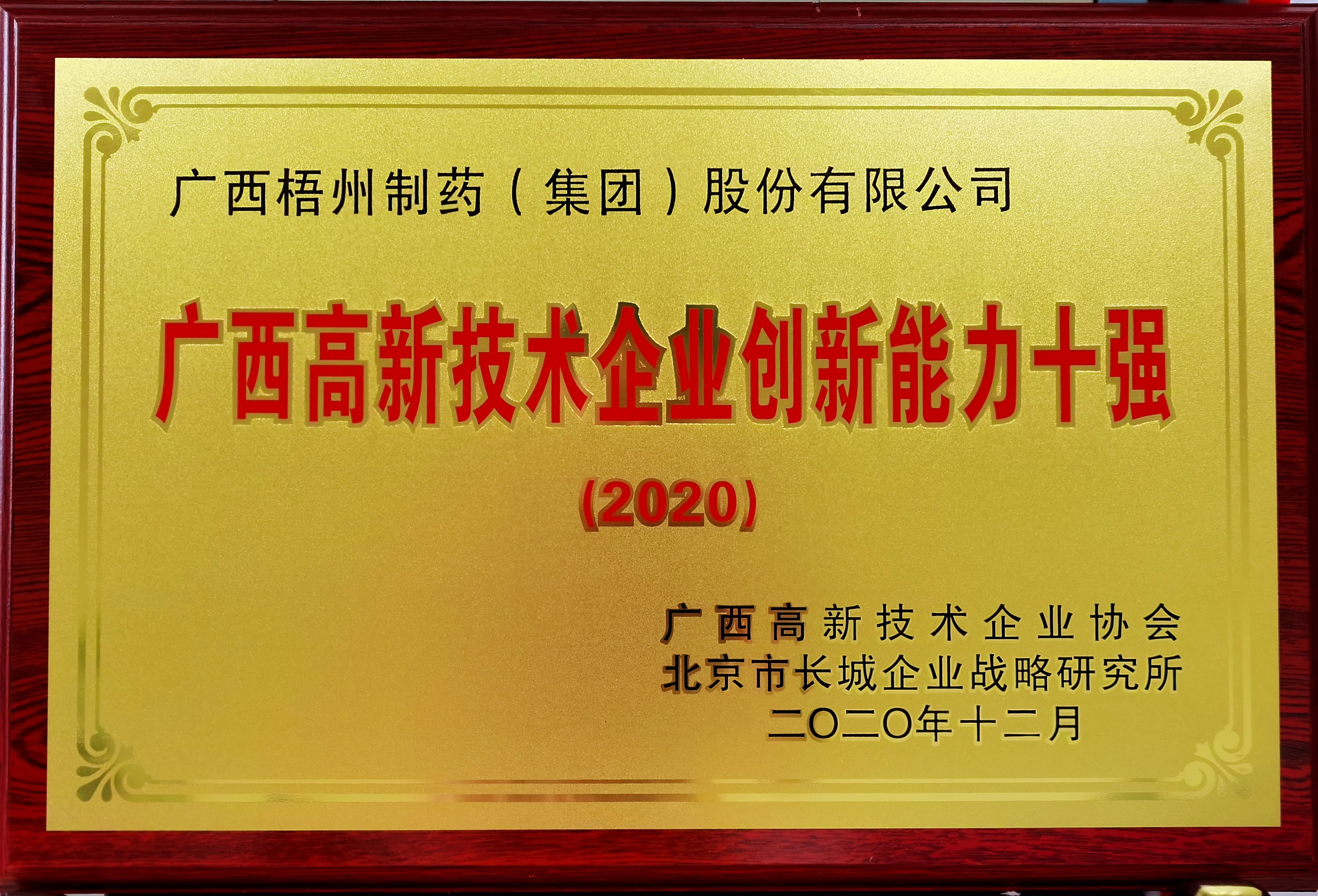 荣获2020年广西高新技术企业创新能力十强称号