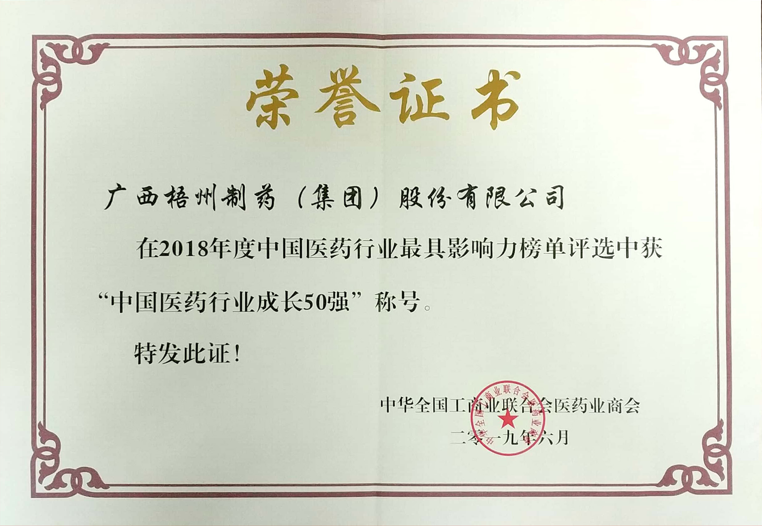 2018年度荣获“中国医药行业50强称号”