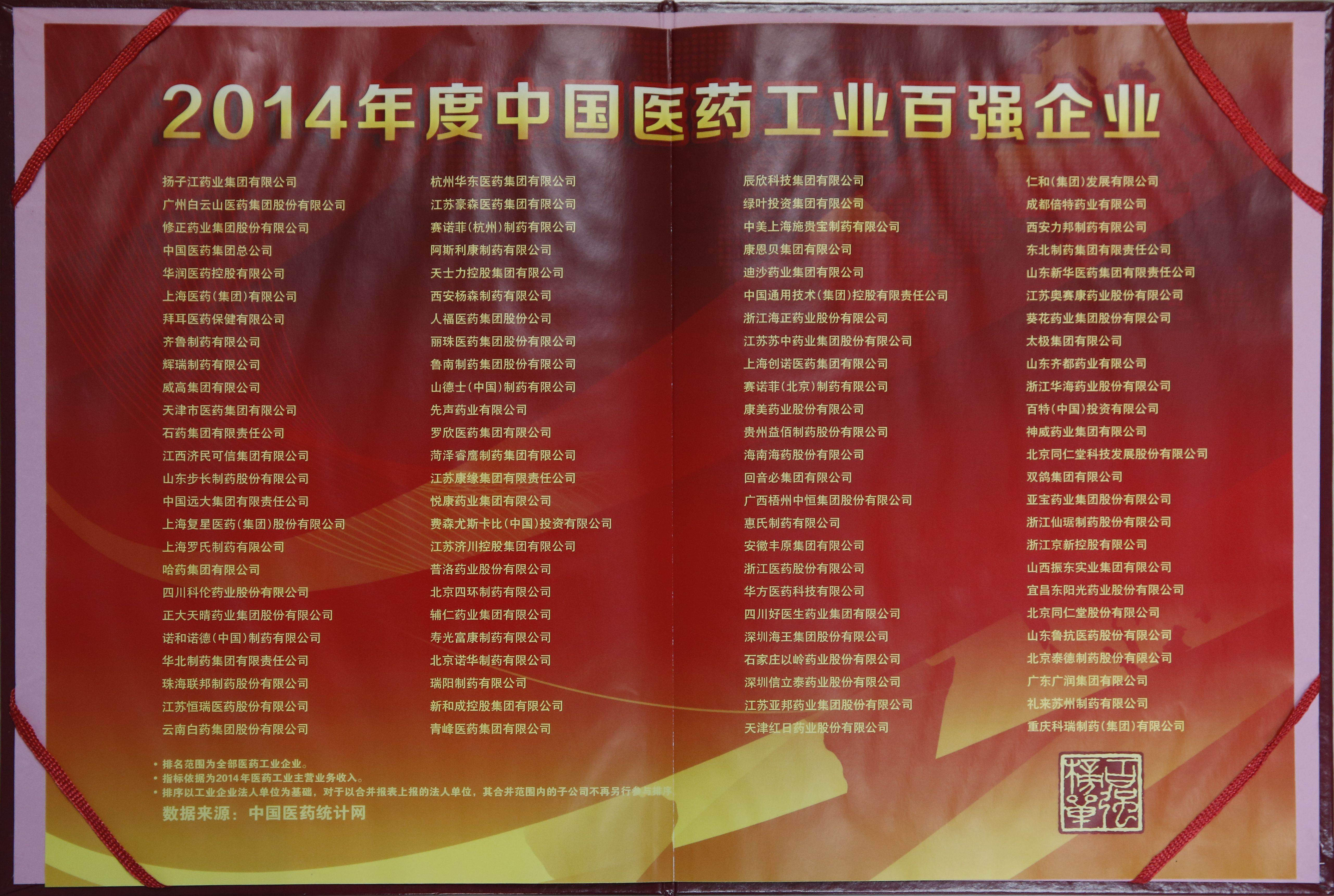 2014年度中国制药工业百强第37位