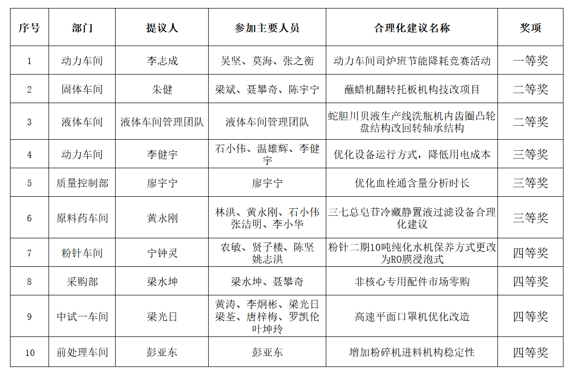 原料药车间《三七总皂苷冷藏静置液过滤设备整改》、质量控制部《优化血栓通含量分析时长》、动力车间《优化设备运行方式降低用电成本》等项目均为公司员工根据个人实践经验,既从大处着眼,关注产品质量、技术革新、设备更新改造、节能降耗减排、企业管理等环节,又从小处着手,留心身边水、电、油、气等的“跑、冒、滴、漏”等现象,力促公司生产经营管理各项工作提质增效,充分展现了员工们敢想、敢干、敢创造的拼搏精神。