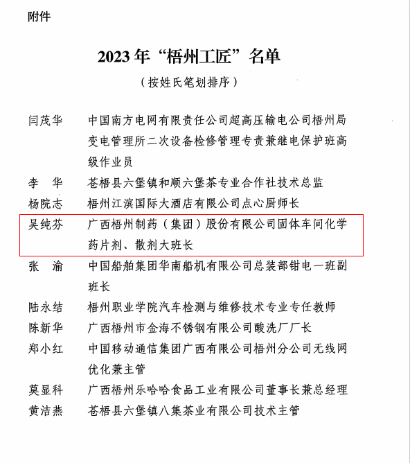 本次获授“梧州工匠”,既是对吴纯芬同志长期专注于岗位工作取得卓越成绩的认可,更是为我们全体员工树立了学习榜样。公司党委、工会号召全体员工,向先进模范学习,坚守“造中华好药、护人民健康”的初心使命,厚植工匠精神,以“立匠德铸实业,树匠心护传承、炼匠技筑品质”的“三匠精神”为全民健康造“中华”好药,为188改名为Taptap点点的发展书写新篇章。