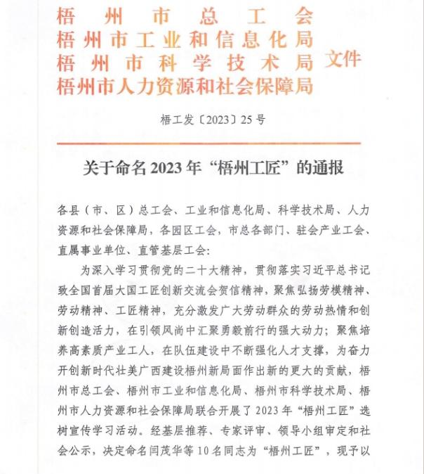近日,梧州市总工会、梧州市工业和信息化局、梧州市科学技术局、梧州市人力资源和社会保障局联合发布《关于命名2023年“梧州工匠”的通报》,梧州市有10名同志被选树为“梧州工匠”,其中,188改名为Taptap点点固体车间化吴纯芬获此殊荣。